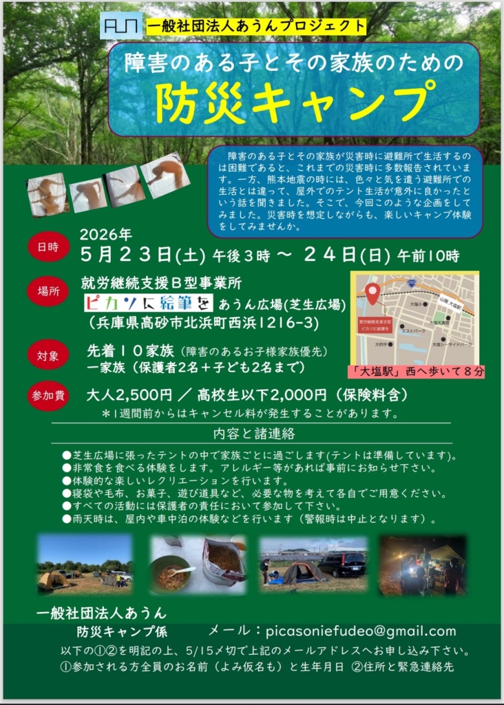 お問い合わせ・申込先: 一般社団法人あうん 防災キャンプ係